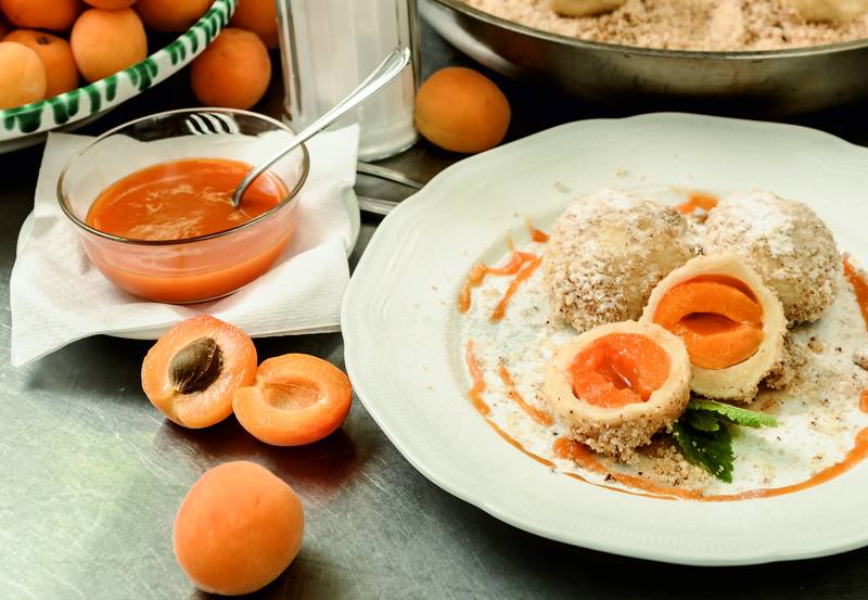 Die Marillen auf einer Seite einschneiden, den Kern entfernen und einen Mokkawürfel, der in Premium Marillenlikör getunkt wird, einfüllen. Mit dem Teig umhüllen und zu gleichmäßigen Knödeln formen.