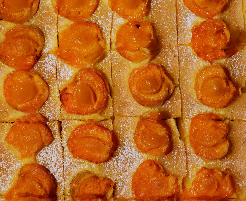 Den Teig auf ein befettetes Backblech streichen, mit halbierten Wachauer Marillen - mit der offenen Seite nach oben - belegen und mit Mandelblättchen bestreuen. Bei 150°C bis zur Nadelprobe backen.
