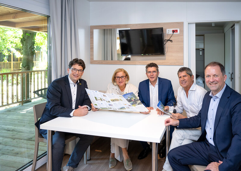 Foto: Der Donaupark Camping Tulln wird vom ÖAMTC betrieben und bietet neben 140 Stellplätzen für Touristinnen und Touristen auch 17 Mobilheime für einen entspannten Urlaub. V.l.: Jakob Pflegerl (ÖAMTC, Direktor Operations WNB), Johanna Mikl-Leitner (Landeshauptfrau von Niederösterreich), Peter Eisenschenk (Bürgermeister von Tulln an der Donau), Franz Libal (Donaupark Camping Tulln) und Bernhard Schröder (Geschäftsführer Destination Donau Niederösterreich). © NLK Pfeffer